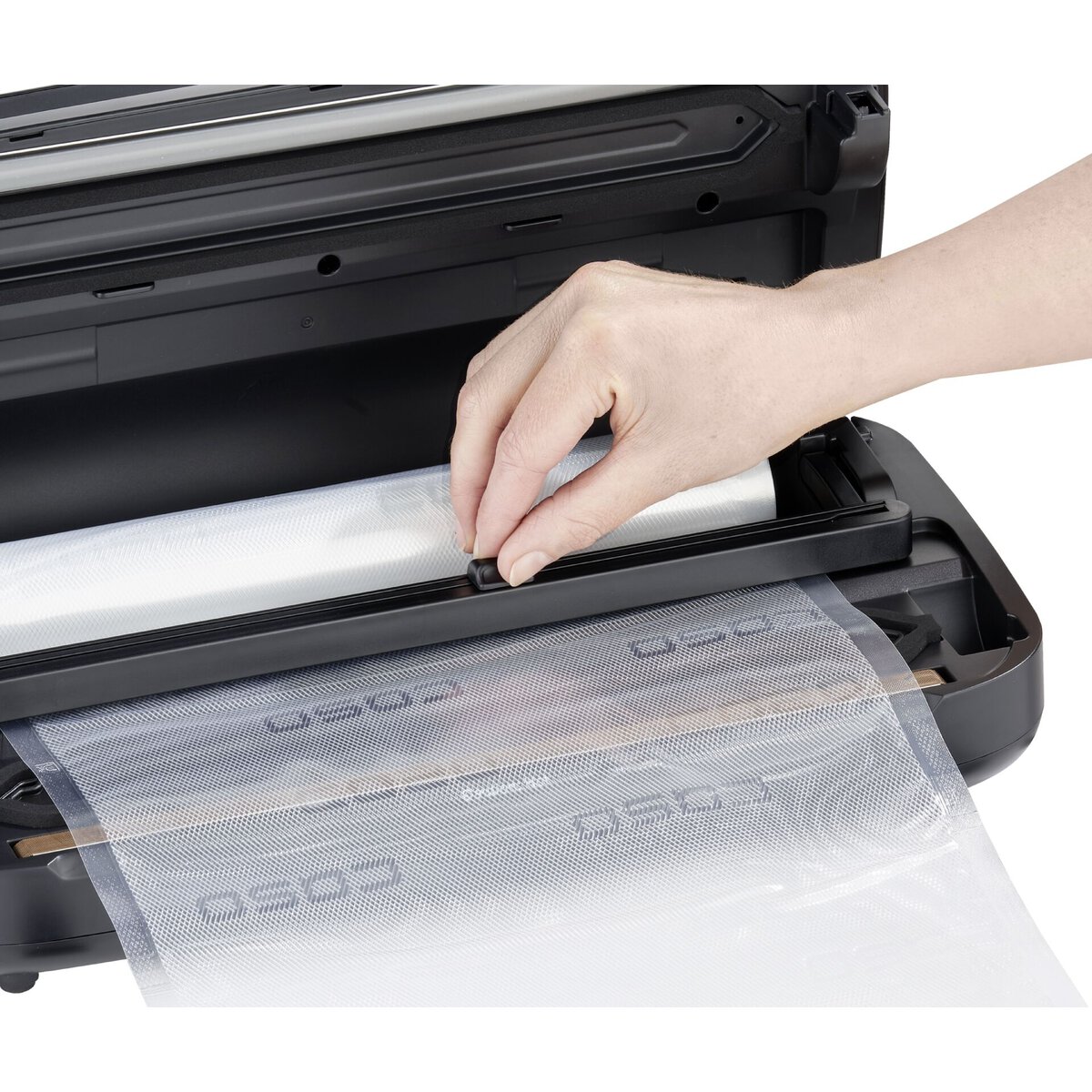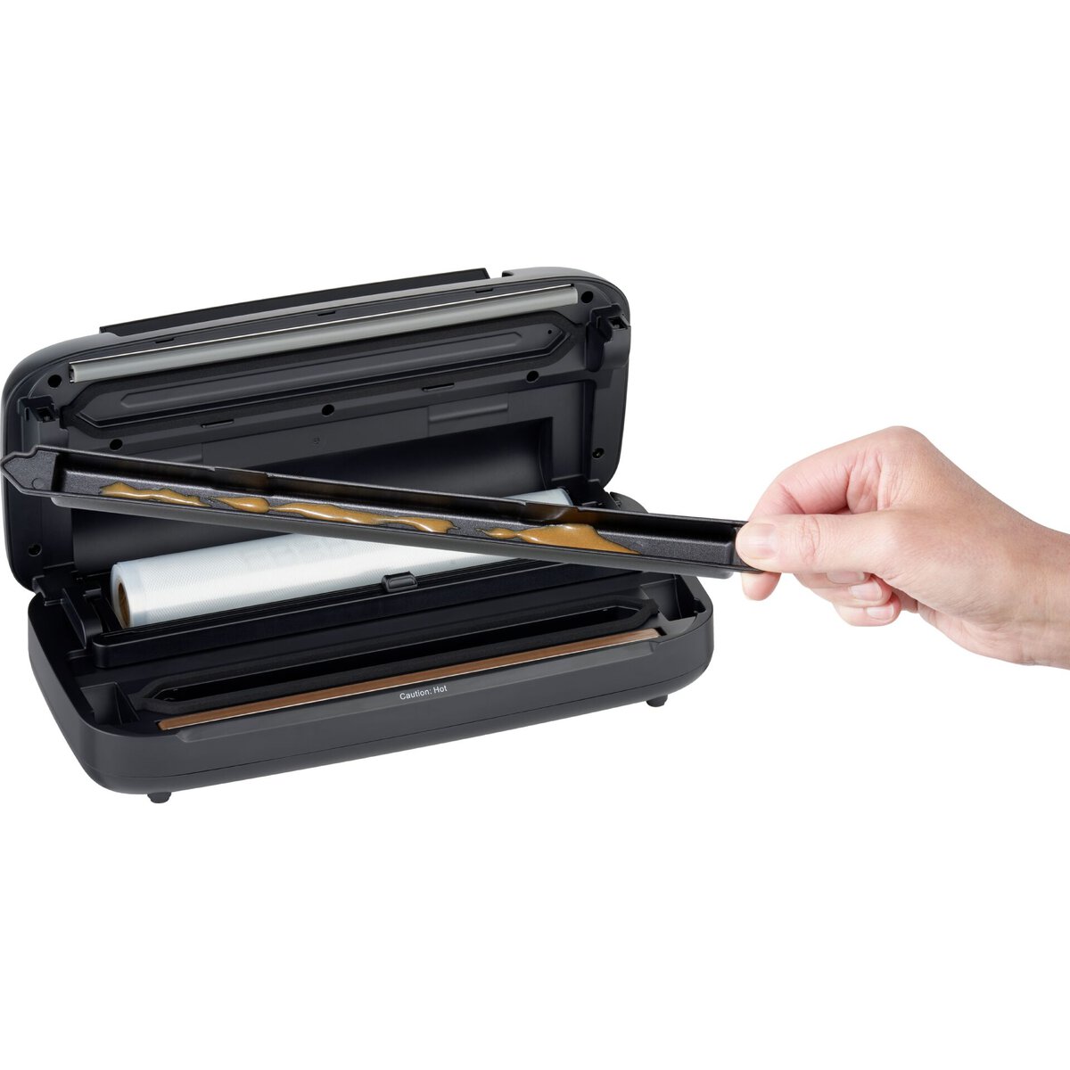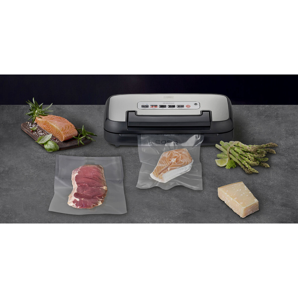 Anschlusswert: 220-240V / 50 Hz, 110 Watt. Pumpe ca. 12L/min. und einem max. Unterdruck von bis zu -0,8 bar, 2,5mm dicke, stabile Schweißnaht für Beutel bis. max. 30cm Breite und beliebiger Länge, automatisches Vakuumieren und Verschweißen, manuelles Verschweißen, regulierbare Schweißzeit für trockene und feuchte Lebensmittel, Pulse-Funktion: manuell regulierbare, stufenlose Vakuumstärke, ideal für weiche, empfindliche Lebensmittel, Marinier-Funktion, integriertes Rollenfach mit praktischem Cutter zum Zuschneiden der Folienrollen, praktische Einhandbedienung, herausnehmbare Auffangschale für angesammelte Flüssigkeit, elektronische Temperaturüberwachung, inkl. 1 Profi-Rolle 28x300cm, 10 Profi-Beutel 20x30cm, 1 Vakuumierschlauch. Passende Beutel und Schläuche: 143510, 143550, 17417, 17418, 17420 u. 17421.