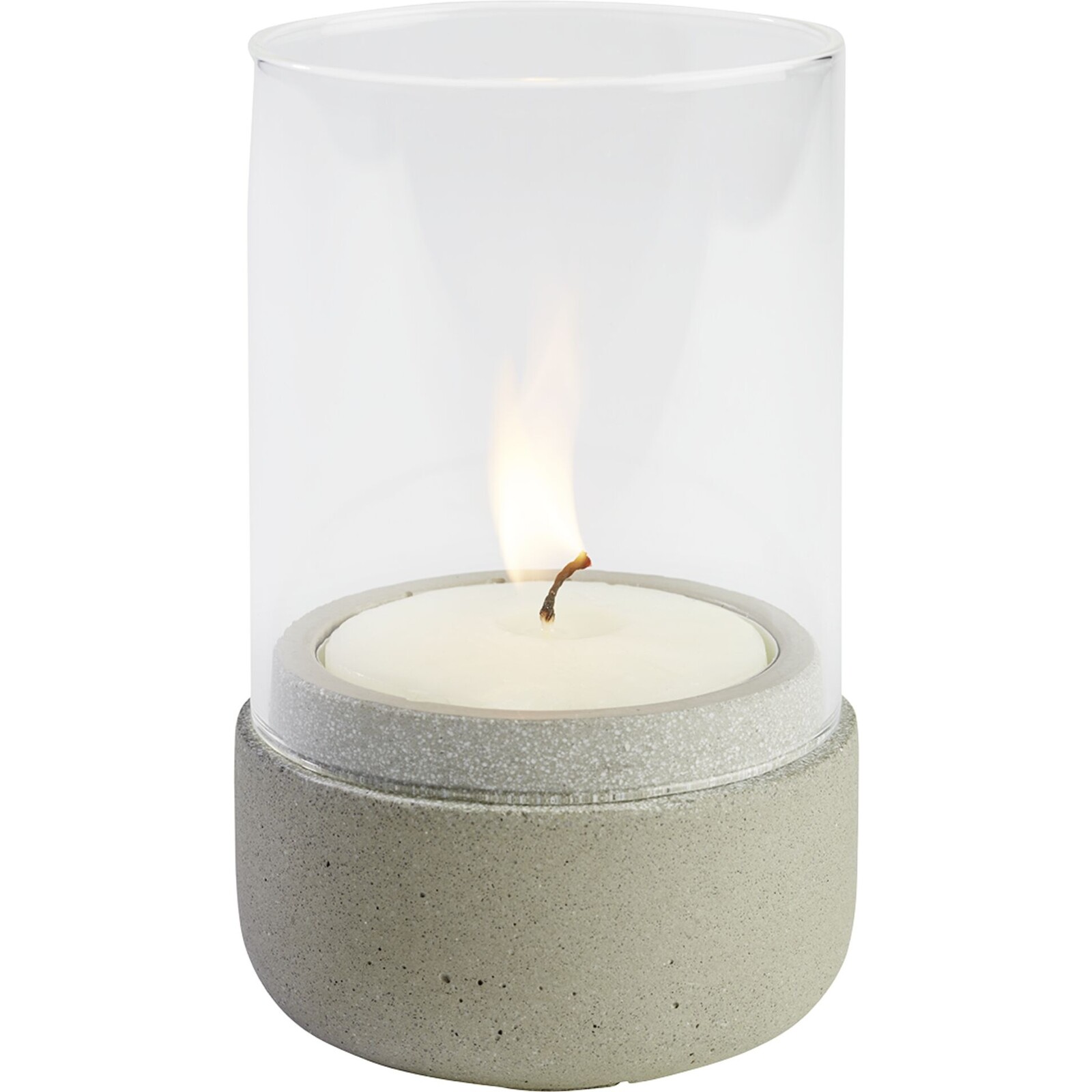 Fassung aus Beton mit möbelschonender Filzunterseite. Klares Windlicht-Glas. Mit Teelichtern bestückbar. Nicht spülmaschinengeeignet.
